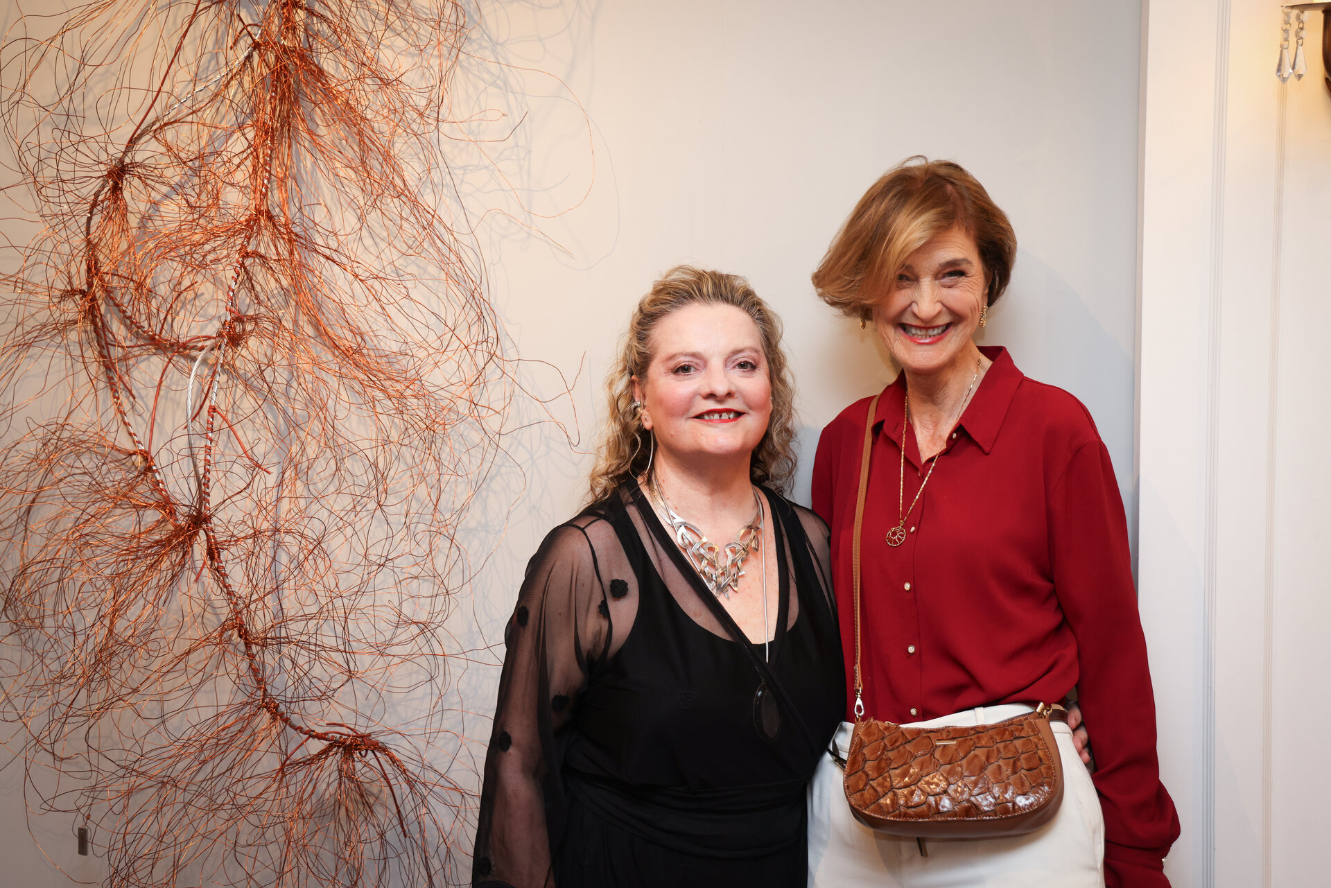Zetti Neuhaus com Claudia Stern junto à uma das obras que integram a mostra (Foto Fredy Vieira/Divulgação)