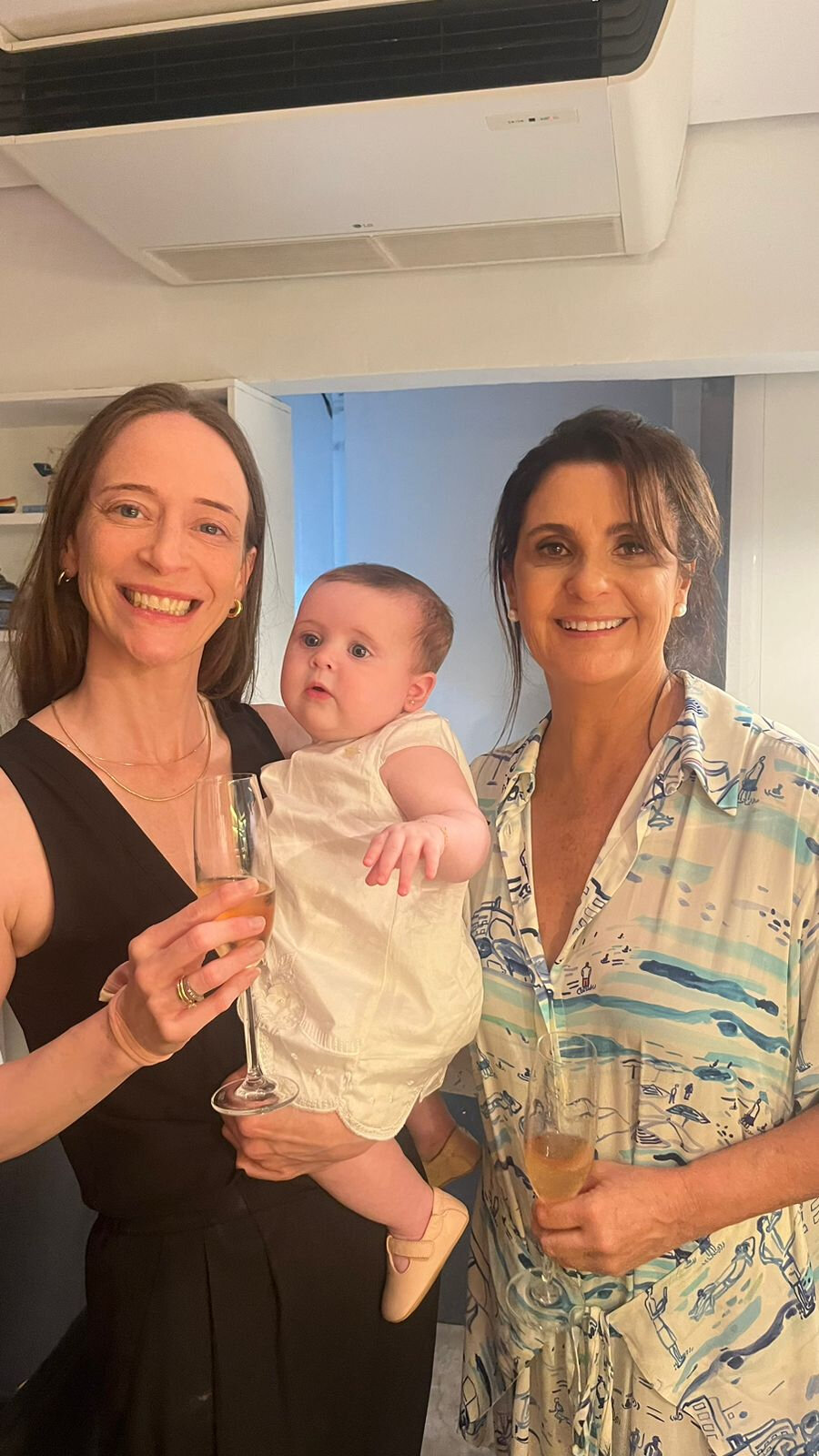 # Luiza Schmidt Moreira, Adriana Fischer e Victor Schmidt Moreira, e a pequena Rebeca, Mario Gustavo Brum e Gurdip Sandhu, que veio de São Francisco da Califórnia para festejar com a amiga, estavam numa das mesas. Beth, muito animada e feliz, teve cantorias e muitos cumprimentos.