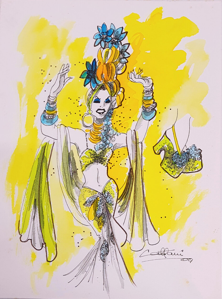 # O estilista Dyrson Cattani, com quem tive uma amizade fraternal, admirava muito Carmen e criou inúmeras ilustrações inspirado nela. Algumas vocês podem ver aqui. O Museu de Porto Alegre Joaquim Felizardo, cujo projeto de restauração e revitalização será lançado dia 13 de março, pretende realizar uma exposição dedicada ao trabalho de Cattani, como comenta Beth Corbetta, diretora da instituição.