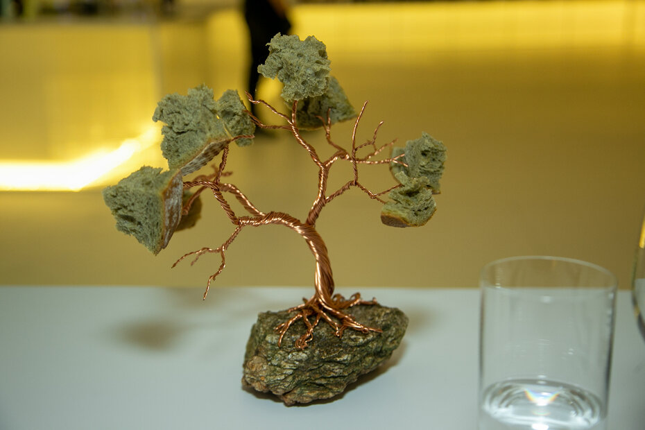 Toque oriental: a árvore, criada em metal nobre e pedras, sustentava pequenas porções de pão (Foto: Lenara Petenuzzo/especial)
