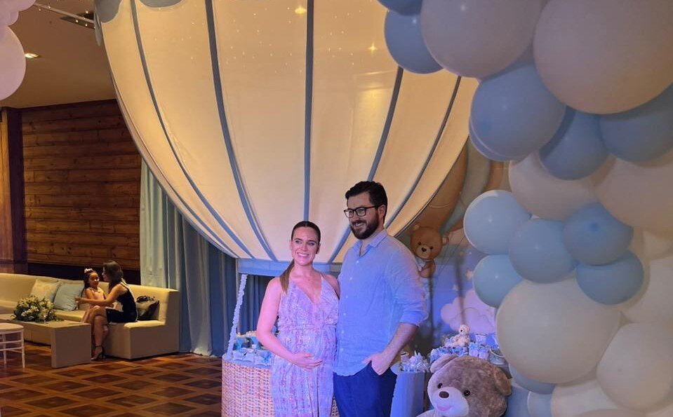 Caroline Naujorks e João Pedro Zelmanowicz Sanvitto no chá de fralda que reuniu um grande grupo na Leopoldina Juvenil (Foto: Divulgação)