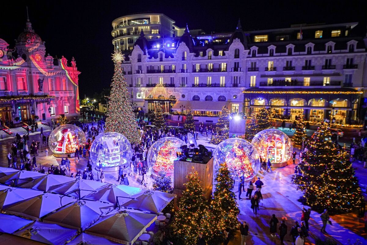 # Na Place du Casino, os grandes globos de neve retornam ao redor da árvore de Natal de mais de 20 metros. As cinco novas cenas dos globos, dedicadas à Magia de Natal de Monte Carlo, acompanham as aventuras das renas Flocon, Rose, Hercule, Stella e Rudolph. O Papai Noel estará no local em datas selecionadas, enquanto a fachada do cassino recebe um espetáculo de som e luz a cada 30 minutos durante dezembro e o período de férias.