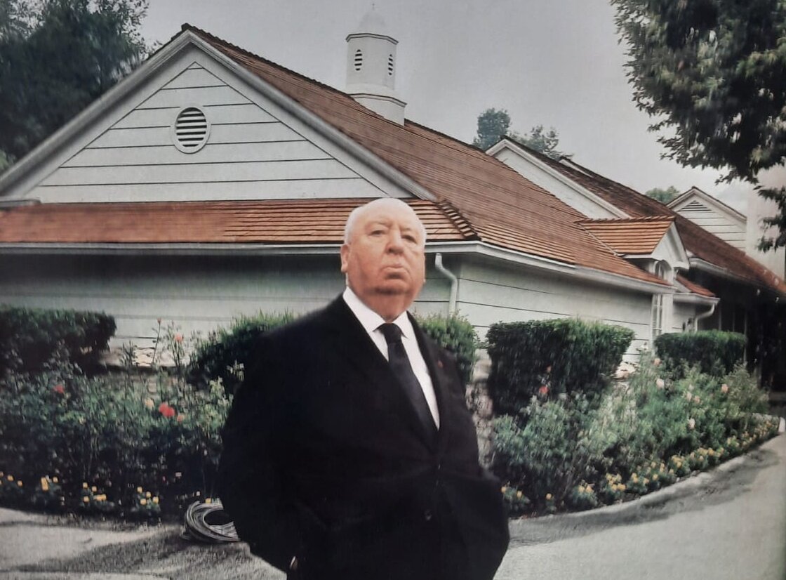 O icônico Alfred Hitchcock junto à morada em que viveu em Los Angeles (Foto: Reprodução)