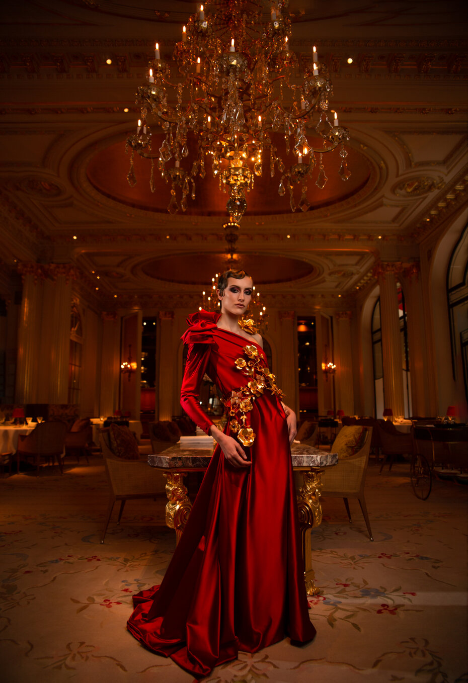 # Reafirmando o posicionamento como endereço da Alta Costura em Paris e comemorando seus 110 anos, o hotel recebe uma exposição inédita iniciada durante a Semana de Moda da Alta Costura de Paris. Em parceria com a French Federation of Custom Couture Creation e a French Confederation of Crafts – Couture & Crafts – a exposição conta com uma coleção de seis vestidos sob medida, desenhados por sete artesãos locais e seis costureiros, especialmente criados para o aniversário do hotel. Cada vestido tem um estilo distinto com apenas um ponto em comum: o vermelho emblemático do hotel.
