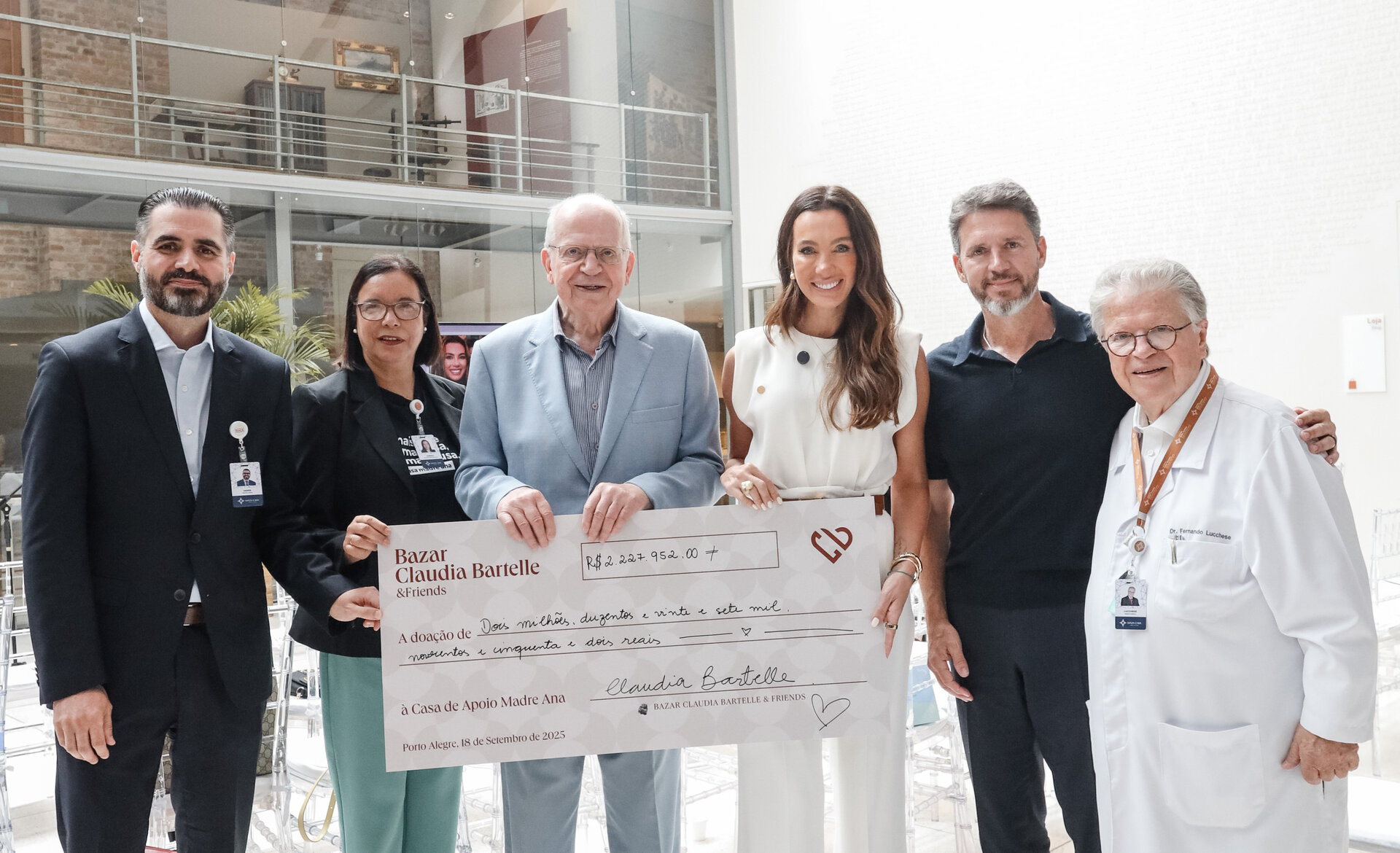 # Na manhã da última quarta-feira (dia 26), aconteceu a entrega simbólica do cheque do valor arrecadado na 6ª edição do Bazar Claudia Bartelle & Friends, realizado em setembro. O evento destinou R$ 2.227.952,00 integralmente à Casa de Apoio Madre Ana. A cerimônia enfatizou a parceria iniciada em 2018 e contou com Claudia e Pedro Bartelle, pacientes e embaixadoras do Bazar, além da presença de Alfredo Englert, provedor da Santa Casa, dos dirigentes da instituição e do médico Fernando Lucchese.