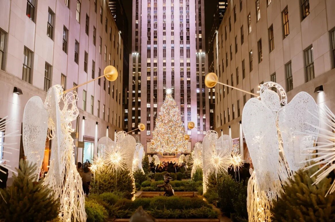 O Rockfeller Center tem ornamentação de criatividade e luxo. A árvore de 22,9 metros é iluminada com 50 mil luzes Led e uma grande estrela de cristal Swarowski (Foto: Divulgação)