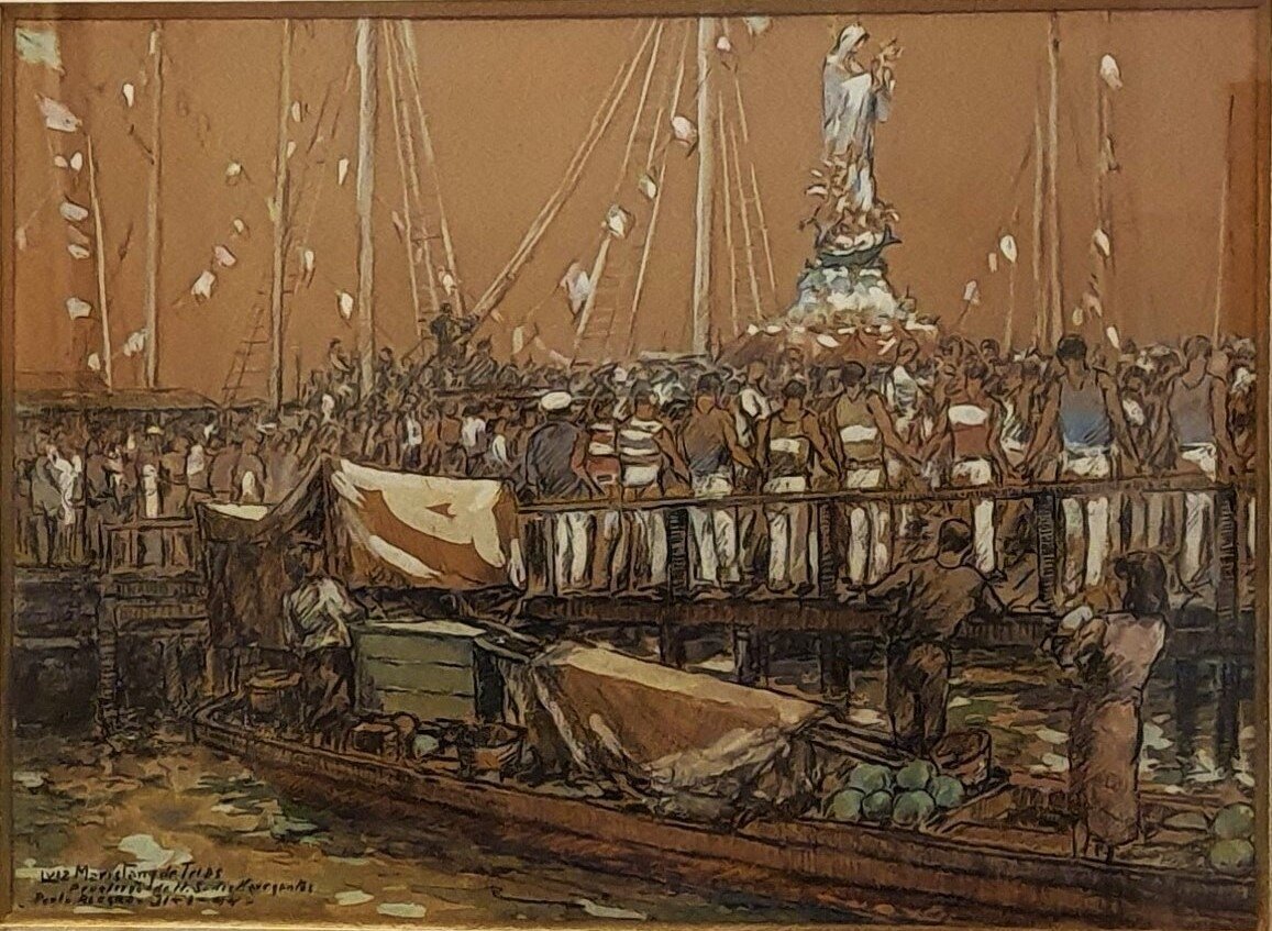 # A Festa de Nossa Senhora dos Navegantes, tradição de mais de 150 anos em Porto Alegre, terá seu ponto alto na próxima segunda-feira (dia 2), com a tradicional procissão de retorno da imagem do Santuário do Rosário (no Centro Histórico) para o Santuário dos Navegantes. A procissão é a maior festa católica da cidade e declarada patrimônio imaterial. A devoção à Nossa Senhora dos Navegantes foi iniciada por Francisco Lemos Pinto, conhecido como Chico Inglês, cujo estaleiro deu nome à ilha do estuário do Guaíba. A procissão lacustre de outros anos inspirou o artista Luiz Maristany de Trias para o desenho da década de 1940, que ilustra a nota.